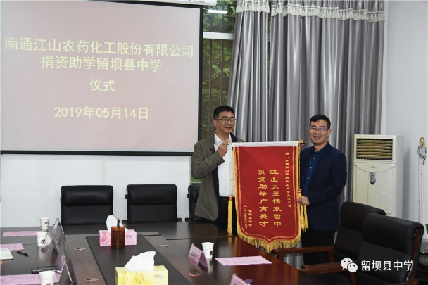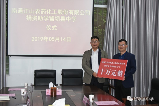 獻(xiàn)上一份愛(ài)心,托起一片希望。在這個(gè)孕育希望的季節(jié),2019年5月14日南通江山農(nóng)藥化工股份有限公司捐資助學(xué)留壩縣中學(xué)儀式在留壩縣中學(xué)會(huì)議室舉行,捐資助學(xué)儀式由留壩縣中學(xué)校長(zhǎng)楊锃主持。