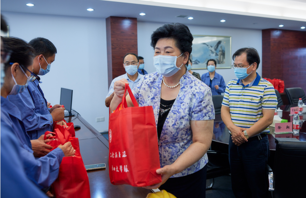 炎炎夏日,酷暑難耐。為進一步加強企業(yè)基層員工疫情防控意識,更好地保障一線職工群眾在高溫下正常生活,8月10日下午,市人大常委會副主任、總工會主席葛玉琴,市總工會黨組書記、副主席葛志娟到江天公司指導疫情防控工作,并看望慰問一線工作者。市國資委黨委副書記、副主任宋建宏,產控集團黨委副書記、副董事長、總經理顧建國,黨委副書記、工會主席成剛等領導陪同。