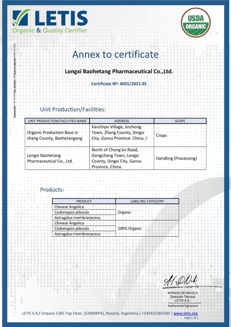 自2017年開始,隴西保和堂在推動(dòng)道地有機(jī)種植基地建設(shè)、有機(jī)產(chǎn)品加工等方面不斷發(fā)力,先后于2019年12月獲得隴西、岷縣、漳縣、渭源、宕昌5個(gè)種植基地的《有機(jī)轉(zhuǎn)換認(rèn)證證書》,2020年12月獲得當(dāng)歸、黨參、黃芪的《有機(jī)產(chǎn)品認(rèn)證證書》,2021年7月獲得當(dāng)歸、黨參、黃芪生產(chǎn)加工《有機(jī)產(chǎn)品認(rèn)證證書》,并成功申請(qǐng)了產(chǎn)品有機(jī)標(biāo)簽。 公司從種子種苗繁育、土壤改良、種植基地建設(shè)、田間管理標(biāo)準(zhǔn)化、采挖加工等一系列環(huán)節(jié)入手,層層把關(guān),厲行標(biāo)準(zhǔn)化有機(jī)種植基地建設(shè)和車間加工建設(shè),實(shí)現(xiàn)了產(chǎn)品“來源可知,去向可追,過程可控,責(zé)任可究”,真正走出了一條產(chǎn)業(yè)優(yōu)、質(zhì)量高、可持續(xù)的發(fā)展新路子。此次美國(guó)NOP認(rèn)證證書的取得,為公司進(jìn)一步走向國(guó)際市場(chǎng)打下了堅(jiān)定的基礎(chǔ)。我們堅(jiān)信隨著公司產(chǎn)品品質(zhì)和知名度的不斷提升,“隴西保和堂”品牌產(chǎn)品會(huì)受到越來越多客戶的推崇和信賴。